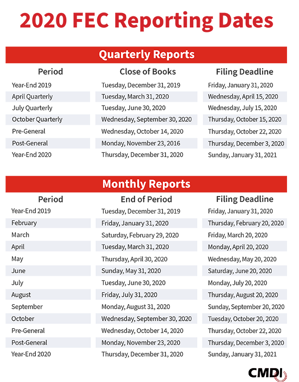 To keep up with these deadlines, download our list of FEC Monthly & Quarterly Filing Deadlines.