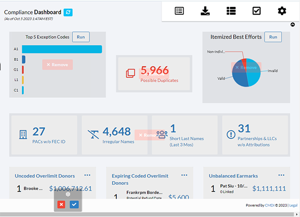 While it’s been possible to customize the Home Dashboard and People Profiles for a while, you can now customize additional Crimson dashboards including People, Fundraising, Compliance, and Events. In order to activate this setting, click on the gray gear icon at the bottom of the screen. That will enable you to drag-and-drop or remove items. When finished, click on the blue checkmark to save.